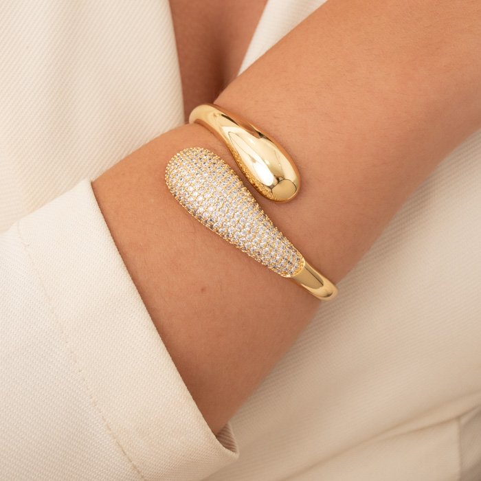BRACELETE DOURADO ABRAÇO PONTAS GOTAS LISA E CRAVEJADA G - Luxo e Exclusividade em Cada DetalheExalte a beleza e a sofisticação da sua revenda com uma peça que transmite requinte e valor. O Bracelete é um símbolo de elegância, perfeito para revendedoras que buscam diferenciação no mercado de semijoias.