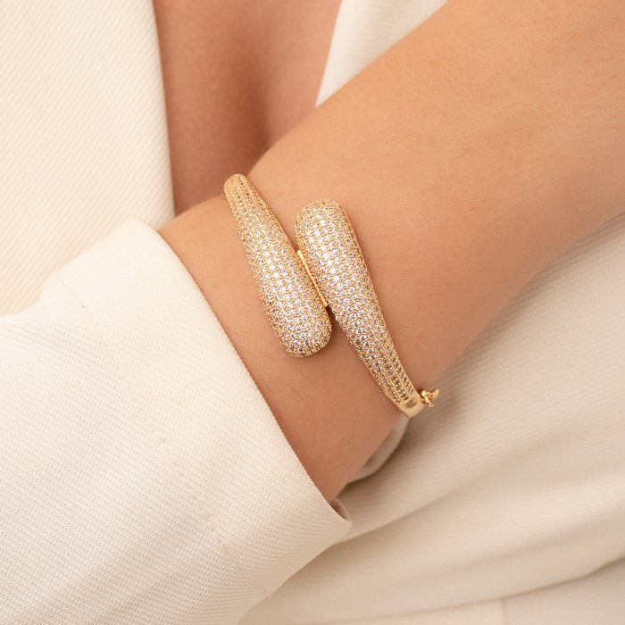 BRACELETE FEMININO GOTAS CRAVEJADAS COM TRAVA - Luxo e Exclusividade em Cada DetalheExalte a beleza e a sofisticação da sua revenda com uma peça que transmite requinte e valor. O Bracelete é um símbolo de elegância, perfeito para revendedoras que buscam diferenciação no mercado de semijoias.
