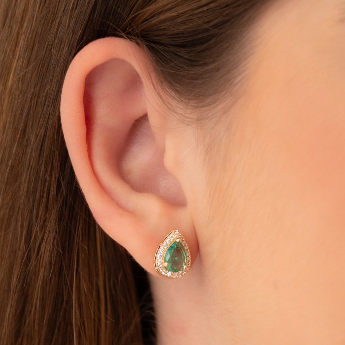 BRINCO GOTA DOURADO ZIRCÔNIA VERDE COM BORDA CRAVEJADA