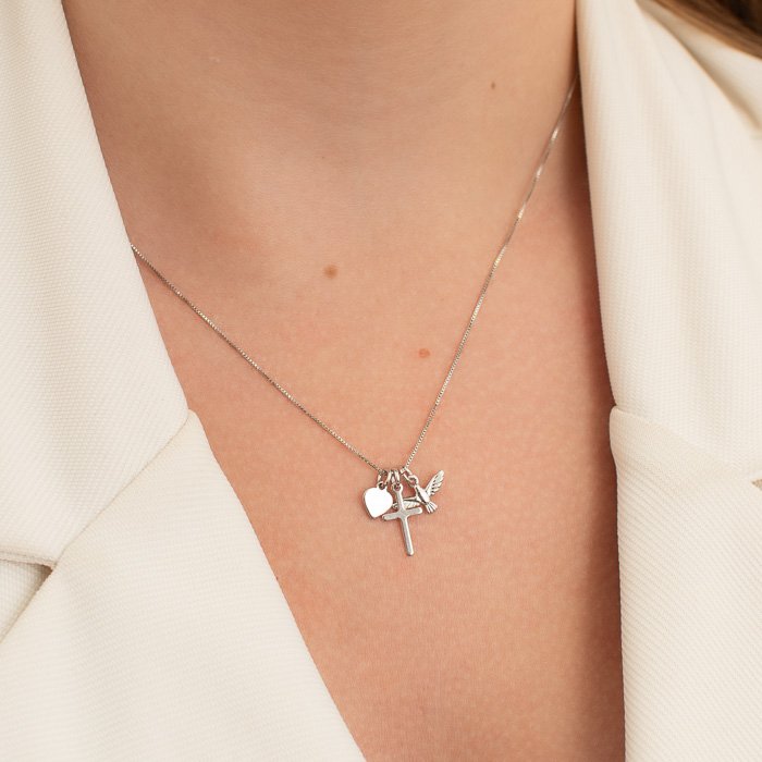 COLAR CRUZ, ESPÍRITO SANTO E CORAÇÃO NA VENEZIANA FINA - Sofisticação e Brilho para Todos os MomentosUma joia delicada e refinada, ideal para mulheres que desejam um toque de elegância e exclusividade. Seu design clássico e acabamento impecável tornam esse acessório indispensável para qualquer ocasião.