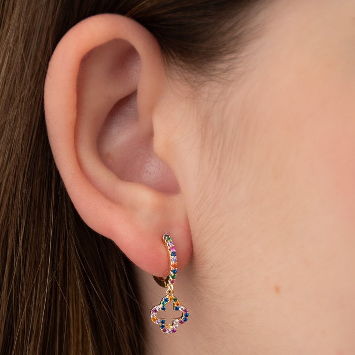 MINI ARGOLA ARTICULADA COM TREVO VAZADO CRAVEJADO COLORIDO – O Clássico Atemporal com Sofisticação e BrilhoUm acessório indispensável para mulheres que desejam unir estilo e modernidade. Com um design refinado e acabamento impecável, essa peça é sinônimo de sofisticação e versatilidade, elevando qualquer produção com um toque de requinte.